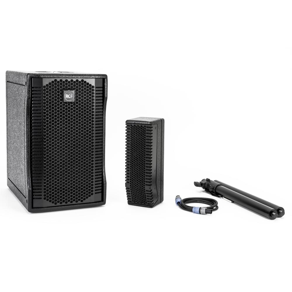 Evox 5 is a portable compact size sound reinforcement system. Evox 5 combines the quality and reliability of RCF transducers with a very high amplification power. The system features five 2.0” full range transducers in the line source satellite and a deep sounding 10” woofer in a bass reflex enclosure. The system is designed to be the perfect portable solution for live music and DJs. The unique vocal attitude and portability make Evox 5 the perfect tool for presentations, corporate events and congresses.